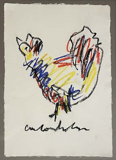De galerie van Peter Leen in Breukelen is een mooi pand met nog mooiere schilderijen en kunstwerken. Het duurde dan ook niet lang voordat ik wist dat ik daar zou gaan kijken om een kunstwerk uit te zoeken waarover ik dit stuk zou gaan schrijven. Het doel van Peter Leen was om een galerie te beginnen zonder drempel. “Toen ik in 1995 mijn galerie in Breukelen opende, was mijn doel een galerie zonder drempel. Dat moest het worden en dat is het nog steeds. Genieten van kunst kun je leren, net als luisteren naar muziek en het drinken van een goed glas wijn. Kunst kopen is emotie.” En dit is hem zeker gelukt, de galerie bestaat nu al 20 jaar en er is onlangs een restaurant geopend in de galerie. Dit zorgt voor een heel bijzonder concept omdat je kan eten terwijl je omringd wordt door zoveel kunst van zoveel verschillende kunstenaars. Hierdoor is de sfeer heel gezellig en bijzonder in de galerie van Peter Leen. Het is een verzameling van sfeer, gezelligheid, eten en aparte kunst. Juist de aparte kunst spreekt mensen aan, zo was er ooit een tentoonstelling met allemaal poppen. Dit vinden mensen enigszins vreemd maar ze kunnen niet stoppen met kijken. De huidige tentoonstelling bevatte echter meer schilderijen dan beelden. En dan voornamelijk kunst van de welbekende Anton Heyboer. Hij bleef mij in eerste instantie bij omdat ik merkte hoeveel schilderijen hij haan of kip noemde. Ik wilde weten waarom en besloot naar de galerie eigenaar te gaan. Dit is een groot voordeel van een galerie, de eigenaar kent zijn kunstenaars goed en weet veel te vertellen.