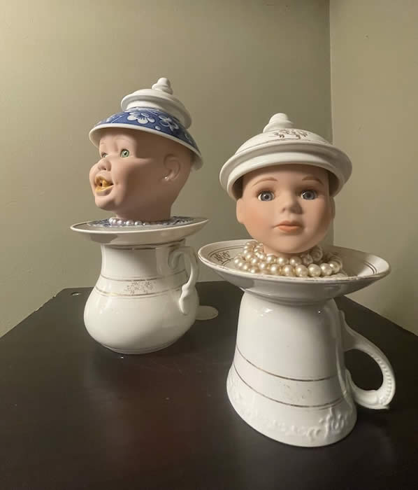 'Dolls & Cups' unica aardewerk, porselein, diverse materialen 25 - 30 cm / 2025 links nog beschikbaar / rechts verkocht |